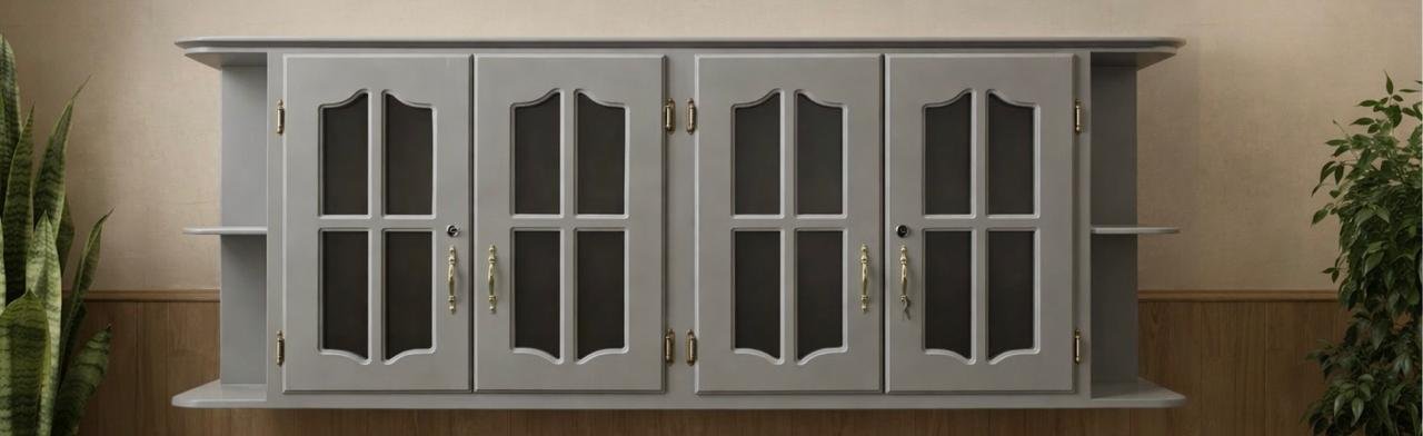 Gabinete aéreo de varias puertas con vitrinas de vidrio, ideal para instalar en la pared y aprovechar mejor el espacio en la cocina. Perfecto para almacenar vajillas, utensilios o artículos decorativos, manteniendo todo organizado y al alcance. Su diseño elegante complementa cualquier ambiente.