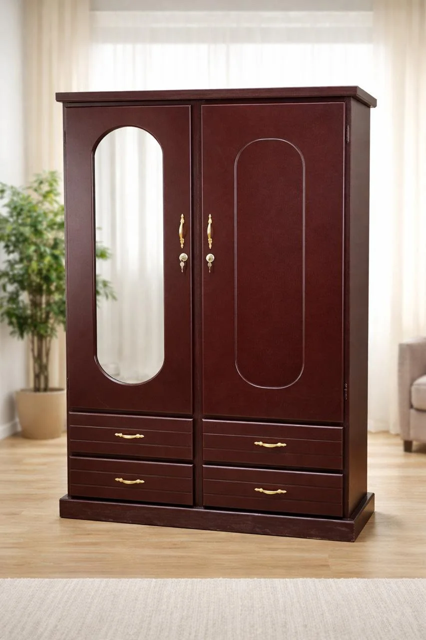 Closet clásico de dos puertas con espejo frontal y gavetas inferiores que brindan espacio adicional para organizar ropa y accesorios. Su diseño elegante y funcional lo convierte en una excelente opción para mantener el dormitorio ordenado y aprovechar mejor el espacio.