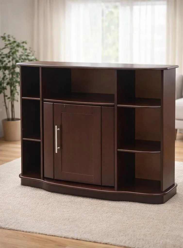 Centro de entretenimiento con compartimentos laterales abiertos y espacio central con puerta para almacenar equipos electrónicos, controles y accesorios. Su diseño práctico permite organizar el área de televisión manteniendo todo en orden, además de aportar un estilo moderno y funcional a la sala.