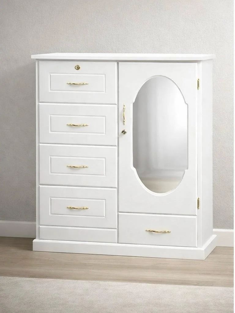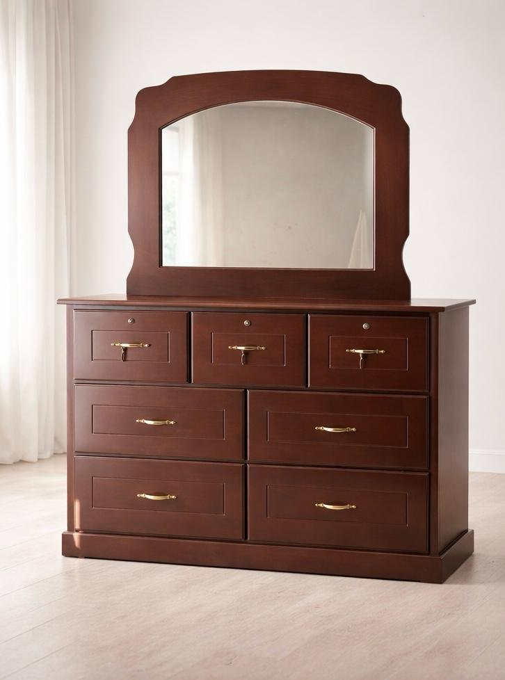 Cómoda amplia de siete gavetas que ofrece excelente espacio para organizar ropa, accesorios y objetos personales. Incluye espejo superior que complementa su diseño clásico, convirtiéndola en una pieza funcional y elegante para el dormitorio. Ideal para mantener todo en orden y aprovechar mejor el espacio