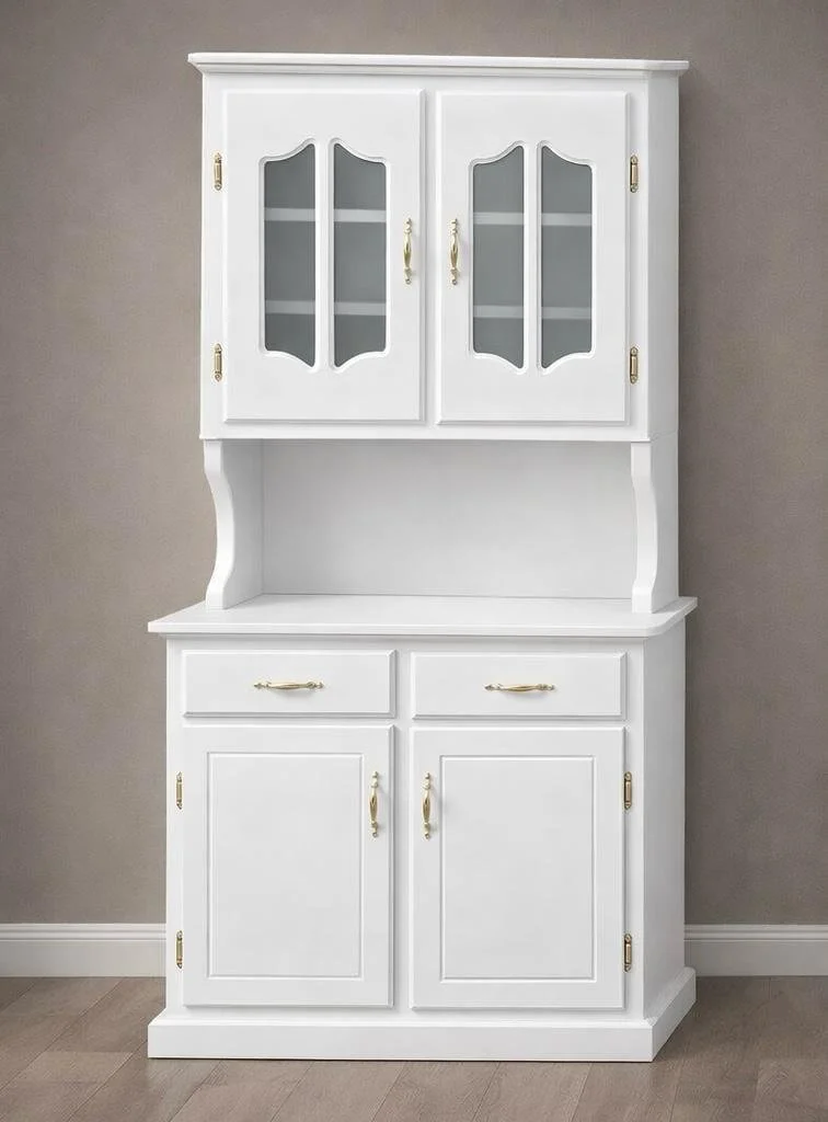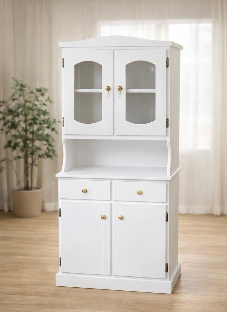 Chinero colonial compacto con dos puertas inferiores, gavetas y vitrina superior con vidrio. Ideal para organizar vajillas, tazas y utensilios de cocina mientras permite exhibir piezas decorativas. Su tamaño práctico lo hace perfecto para espacios más pequeños sin perder estilo ni funcionalidad.