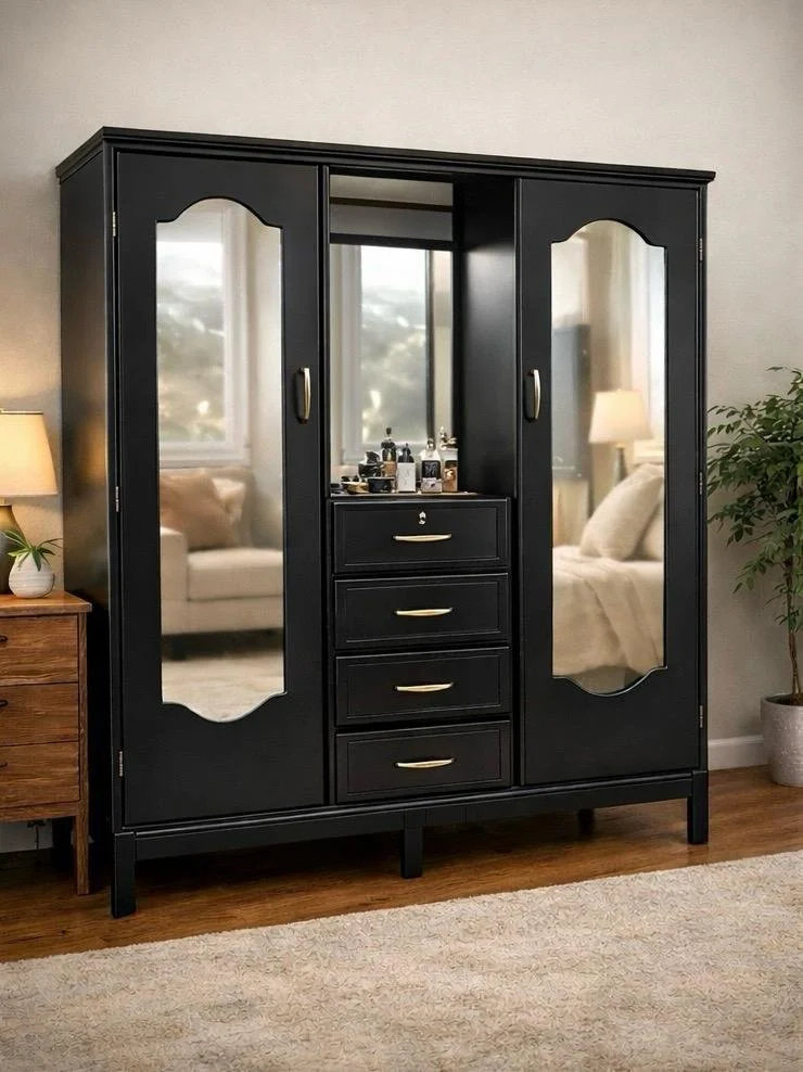Closet de estilo clásico con tres puertas, espejos laterales y gavetas centrales para una mejor organización. Su diseño combina funcionalidad y elegancia, ofreciendo espacio suficiente para ropa, zapatos y accesorios.