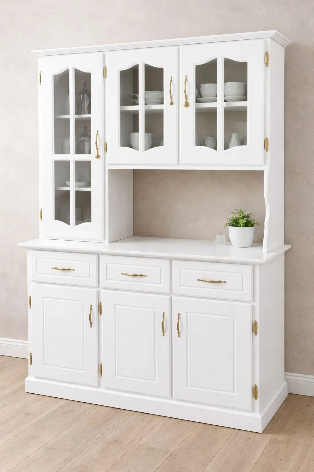 Chinero de estilo colonial con tres puertas inferiores, gavetas centrales y vitrinas superiores con vidrio. Ideal para almacenar y exhibir vajillas, utensilios y artículos decorativos, aportando organización y un toque elegante al comedor o la cocina.