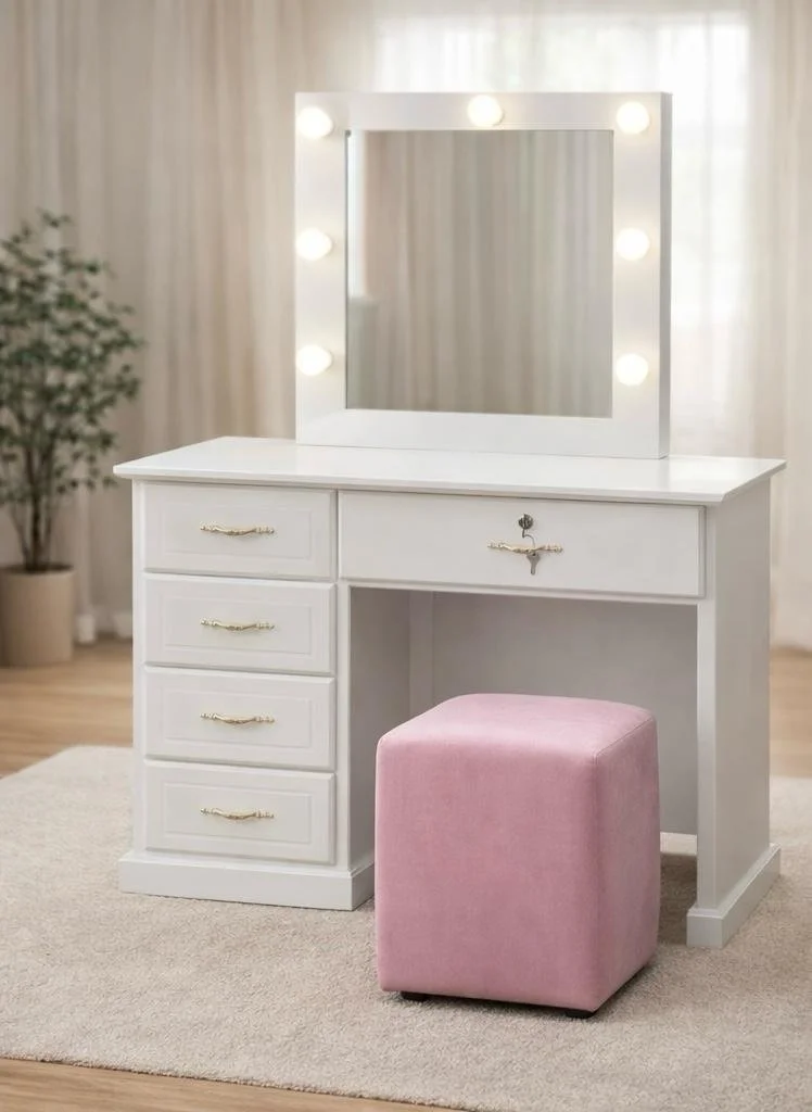 Vanity sencillo con espejo amplio y varias gavetas que brindan espacio práctico para organizar maquillaje, accesorios y objetos personales. Su diseño moderno y funcional lo convierte en una excelente opción para el dormitorio, ofreciendo comodidad y estilo en un solo mueble.