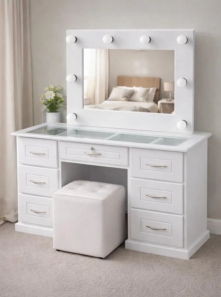 Tocador tipo Vanity con diseño elegante que incluye espejo amplio y superficie de vidrio. Cuenta con múltiples gavetas a ambos lados que brindan espacio ideal para organizar maquillaje, accesorios y objetos personales. Su estilo moderno y funcional lo convierte en una excelente pieza para el dormitorio.